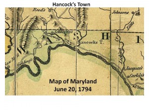 The historical perspective provided on the Hancock Maryland web site indicated that William Russell laid out the town along the main road from Fort Frederick to Fort Cumberland a short time before 1789. He called it William’s Town, for which no reason was given. Confusion existed for a number of years as the area was known as both William’s Town and Hancock’s Town. This confusion may have been due to two areas of development that were proximate but adjacent to each other until, for unknown reasons, William’s Town was dropped from any deeds written after 1810. Interestingly, a map Of North America published in 1771 for Carrington Bowles in London, shows a site on the “Powtomac” [sic] in the general area as “WilliamssFer” [sic]. Likewise, two other map sources, published before 1772, mark Williams Ferry, however, there were also several other ferries nearby, one of which was west but close to Williams Ferry. A map published in 1795 refers to the area as “Hancocks T.” the T. standing for “town”. The mixed naming of the town may be due to the two ferry names under Williams and Hancock. Whether Hancock bought out Williams or there were actually two ferries has yet to be determined. The Hancock web site further indicated the town was incorporated 1853, by an act of the Legislature, and that no other name was considered but Hancock. “Town” was dropped from the name.